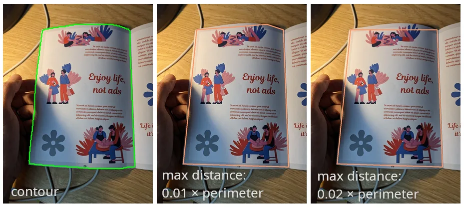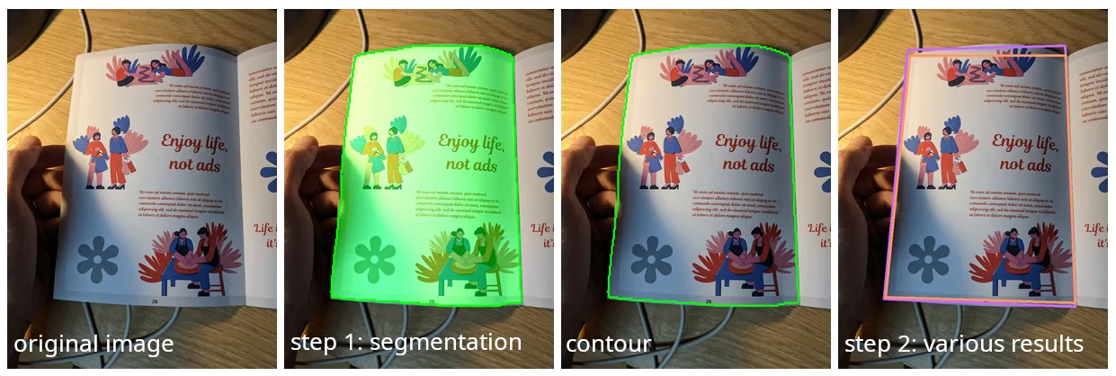 This algorithm fixes the problems Douglas-Peucker had with missing or rounded corners: we can reconstruct corners that are not part of the original contour. It also handles cases better when the detected document pixels (the segmentation mask) are imperfect, because it can rely on partial edges to reconstruct them. That doesn't mean it can save the worst cases, but that's still quite valuable.