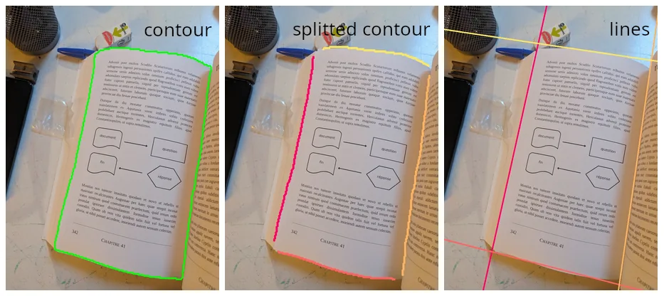 I looked for a different kind of algorithm, that is more adapted to identifying a document. A key intuition is that edges are long and stable parts of the contour, while corners are short and often noisy. Instead of focusing on the small corner regions, we can rely on the long straight segments that make up most of the document boundary. There are well-known mathematical ways to fit a line based on a set of points, so the main challenge is to split the points of the contour so that we can define a line for each edge.