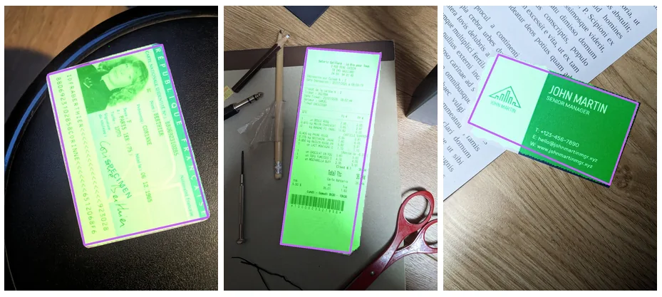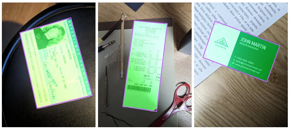 - Some documents have rounded corners (for example some identity cards). The algorithm then selects a point on the contour that is close to the corner but it has to "cut" a bit the edges of the document.